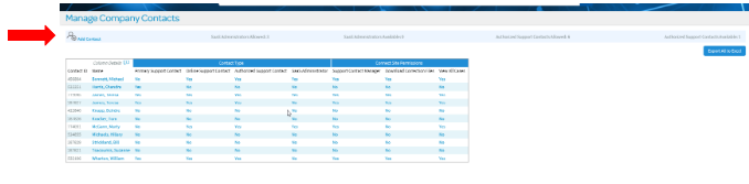 Only the Primary Support Contact or Support Contact Managers within the Support Center can add/edit/remove contacts on behalf of the company.