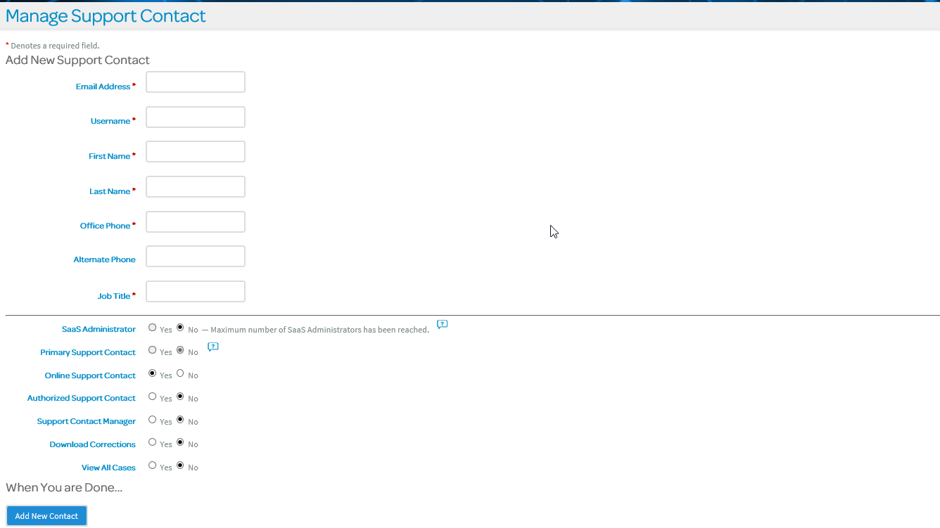 - Support Contact Manager - Select Yes if you want the contact to manage support contacts and the support functions they can perform.